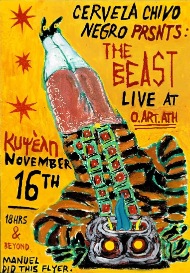 Την Πέμπτη 16 Νοεμβρίου στις 18:00 ανοίγει τις πύλες της για το κοινό η ατομική έκθεση του Κολομβιανού ζωγράφου Manuel Hernández Ruiz στον χώρο τέχνης o.art.ath στην Κυψέλη. H έκθεση ζωγραφικής με τίτλο «The Beast» περιλαμβάνει πίνακες, σχέδια, χάρτες, σημαίες και εκδόσεις και θα παραμείνει ανοιχτή έως τις 25 Νοεμβρίου.